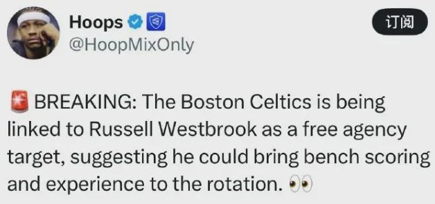 近日美媒Hoops爆料凯尔特人有意在自由市场签下威少,希望为球队的替补阵容补充得分火力和经验。