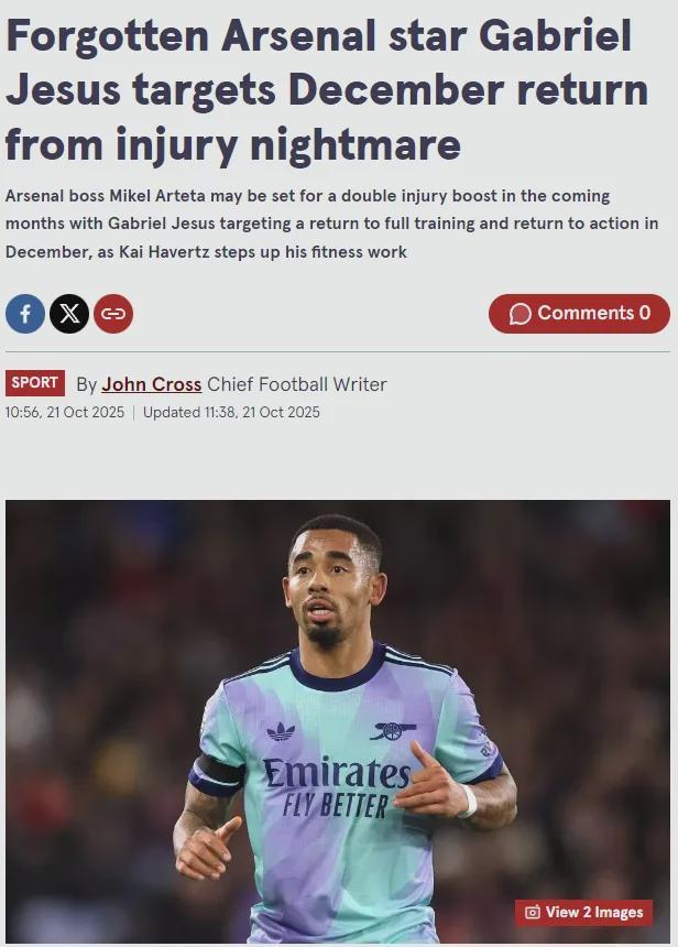 镜报蒋叔消息,热苏斯目标在12月份恢复完整训练并参与一线队的行动,这名前锋复出的决心让枪手医疗团队印象深刻,巴西人已经可以在室外参加一些训练课。